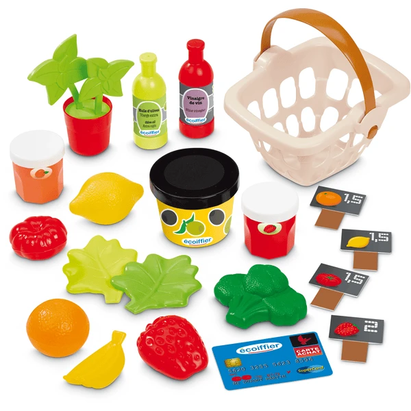 - Met speelfruit en -groenten, lege verpakkingen voor speelfood, een praktisch boodschappenmandje, prijzen child en een weegschaal